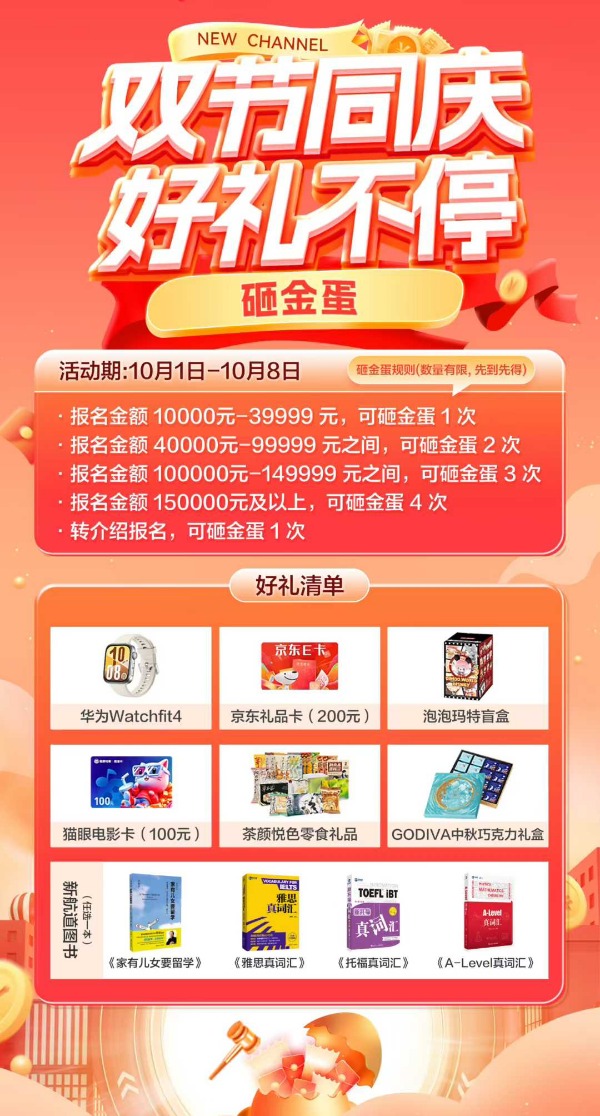 双节同庆,好礼不停假期报名,新航道秋季班现场砸金蛋,100%有奖华为手表/京东卡/电影卡/labubu盲盒…超多惊喜等你解锁~