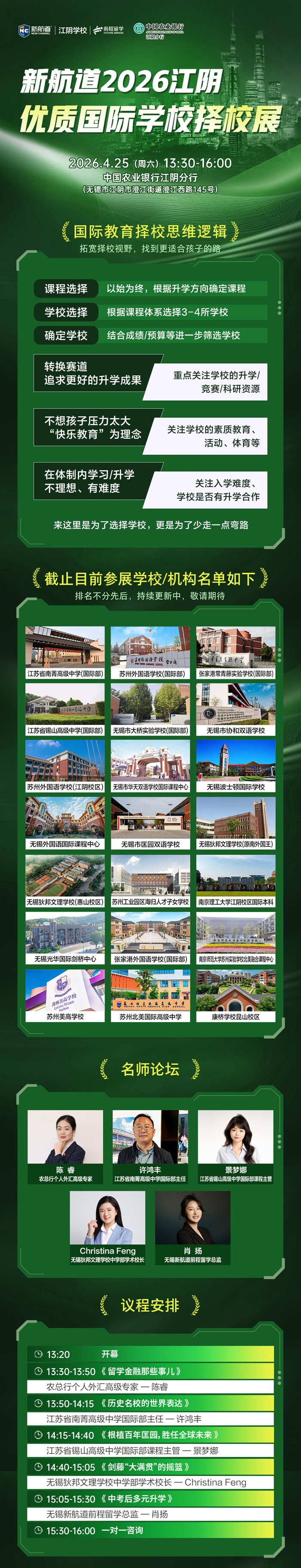 无锡新航道 > 热门新闻 > 新航道2026江阴优质国际学校择校展(4月25日)