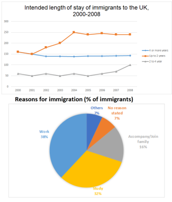 The line graph illustrates how long immigrants intended to stay in Britain between 2000 and 2008, and the pie chart compares different reasons for immigration for the year 2008.