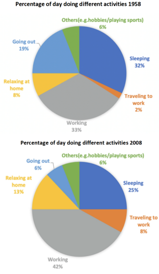 [2024/ 3/ 16] The pie charts below show the percentage of time working adults spent on different activities in a particular country in 1958 and 2008.