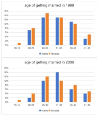 [2024/ 3/ 23] The charts give information on the ages of people when they got married in one country in 1996 and 2008.