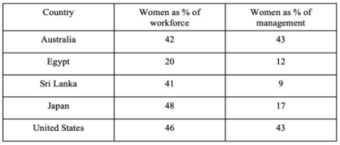 [2024/ 4/ 7] The table below shows the percentage of women in workforce and management in five countries in 2022.