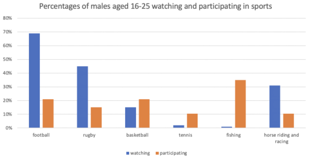 The bar chart presents information about the proportions of 16-to-25-year-old men watching and participating in 6 types of sports.
