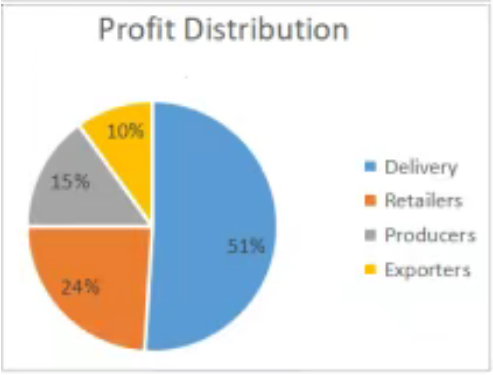 Regarding the composition of profits, it is clear that coffee profit was mainly derived from delivering process(51%), more than twice the figure for retailing. A lower proportion of profits went to producers(15%), 5% higher than the figure for exporters.