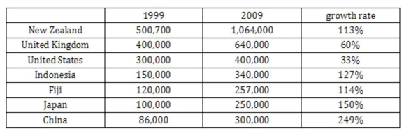 We can see that in the initial year, New Zealand took the lead in the number of Australian tourists, with the figure of 500,700. UK and US came next, with 400,000 and 300,000 Australian people making the trip. After 10 years, arrivals to New Zealand still ranked the top, rising significantly by 113%. A less remarkable growth by 60% and 33% was found in the other top two popular destinations.