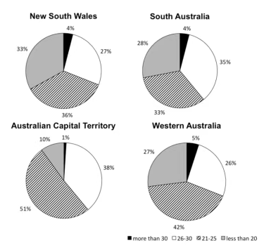 A different pattern of class sizes could be found in the other two states. Specifically, roughly half of the classes in Australian Capital Territory were comprised of 21-25 students, in contrast to the proportion of classes having 26 to 30 students(38%). Classes with under 20 students occupied 10% in this state, 9% higher than the figure for classes having over 30 students. Likewise, in South Australia, classes with the largest number of students also took up the smallest percentage(4%). The other three types of classes shared a similar figure, at roughly 30%.