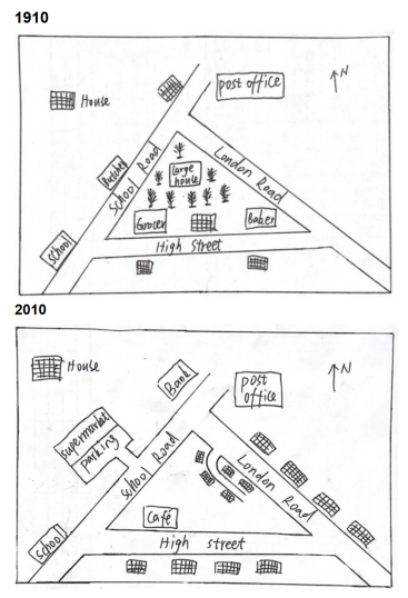 Subsequently, remarkable changes had taken place to this village after 100 years. The previous large house and surrounding trees in the center were removed to make way for a newly built branch road leading to London Road, with some houses distributed on both sides. Noticeably, 4 units of housing had been constructed on the northern side of London Road. On the south of High Street, we can see the addition of two groups of houses, whereas a Cafe had taken up the place of the former facilities on the opposite side. In terms of School Road, although the initial school and post office remained unchanged, the previous butcher shop was transformed into a supermarket, and a separate parking space was available for customers. To the north of it, a bank was added on the original site of houses.