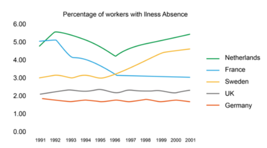 The line graph illustrates changes in the proportions of employees who were absent from work due to illness for 5 days in Netherlands, France, Sweden, Britain and Germany between 1991 and 2001.