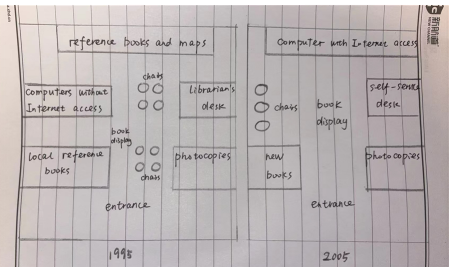 Looking at the information in more detail, we can see In 1995, there was an entrance on the southern side. Two groups of chairs occupied the center of the library, with some books for display located nearby. On the northern side of the library was a section specially designed for reference books and maps. Looking at the western side, we can f i n d that there were some computers without Internet access and some local reference books, while a librarian’s desk and photocopies were sited on the eastern side of the library.