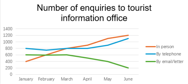 The graph below shows the number of enquiries to tourist information office made by telephone, letter/email, and in person from January 2001 to June 2001.