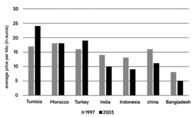The chart below shows the average price per kilo of clothing imported into the European Union from seven major countries of origin in 1997 and 2003.