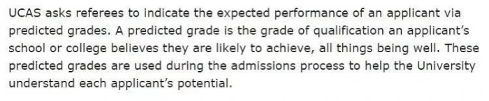 UCAS要求推荐人通过预估分来表明申请人的预期表现,预估分是申请人的学校或学院认为他们在一切顺利的情况下可能取得的合格成绩。