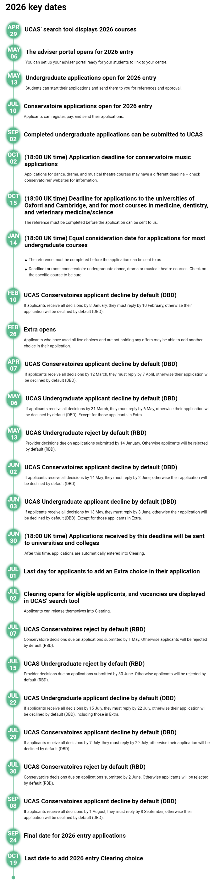 UCAS英国本科网申正式开放,准备好材料的同学可以开始递交了,申请牛津剑桥和医学类专业的同学要特别注意,申请将在每年的10月中率先截止,而大部分UCAS本科专业将于1月中下截止申请。下面给大家列出2026申请各时间节点一定要记牢。