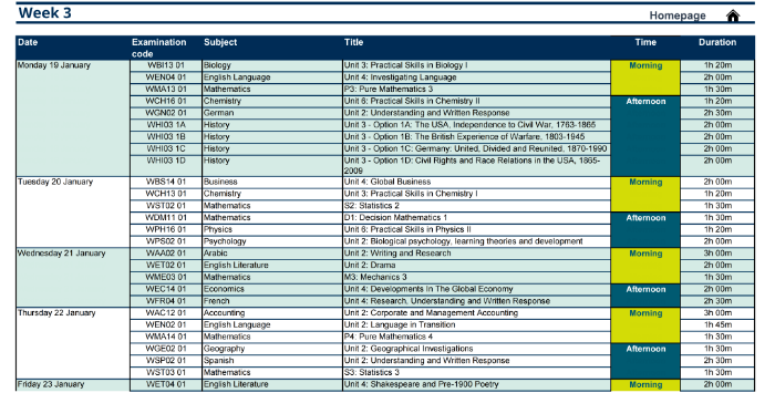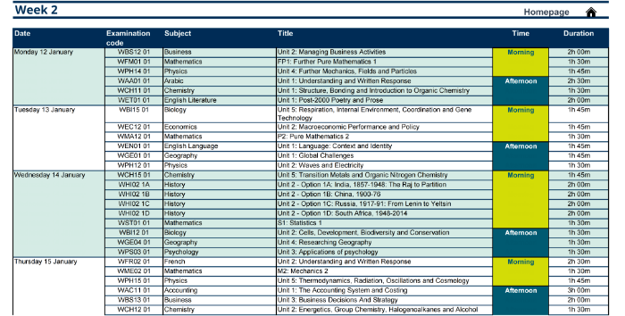 考试科目包括:生物、商务、化学、经济、英语语言、英语文学、进阶数学、地理、数学、物理、心理学。