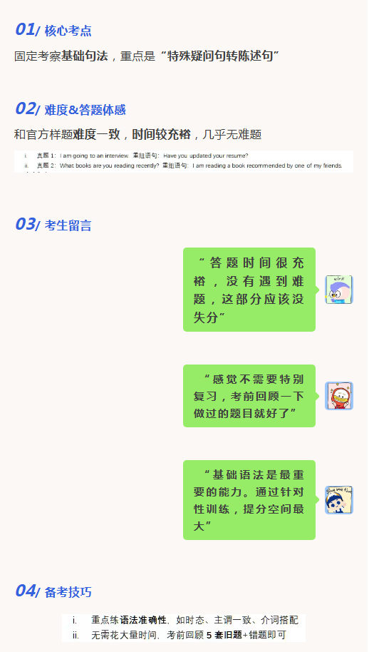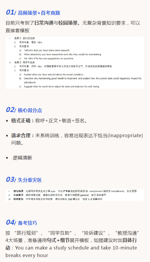 1、题型难度区分明确:造句题最容易,邮件写作失分率。